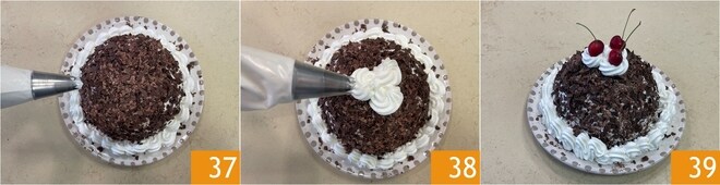 Schließlich mit einem Spritzbeutel eine Umrandung an der Basis 37 und dekorative Tuffs auf der Oberfläche 38 gestalten, die mit drei Kirschen in der Mitte 39 vervollständigt werden. Lassen Sie das Schwarzwald-Zuccotto vor dem Servieren mindestens eine Stunde im Kühlschrank abkühlen.