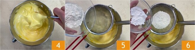 Mischen Sie vorsichtig 4, dann sieben Sie das Mehl 5 und das Backpulver 6 in die Masse.