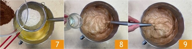 Fügen Sie auch das gesiebte Kakaopulver 7 hinzu und gießen Sie zuletzt das Öl 8 hinzu, wobei Sie weiterhin mit einem Teigschaber 9 rühren.