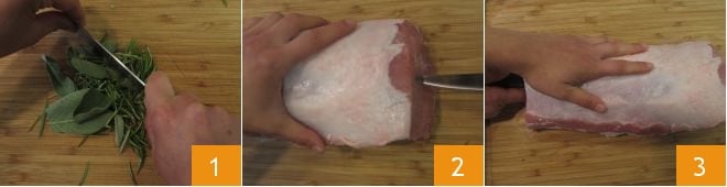 Um den Schweinebraten mit Pflaumen zuzubereiten, hacken Sie zuerst die Kräuter fein 1. Mit einem langen und scharfen Messer machen Sie einen zentralen Einschnitt in die Mitte des Schweinerückens und durchziehen die gesamte Länge von einem Ende zum anderen (2-3), um ein inneres Loch zu schaffen.