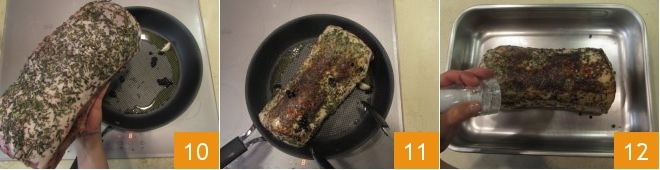 und legen Sie das Fleisch hinein 10, braten Sie es bei hoher Temperatur an und drehen Sie es von allen Seiten 11. Übertragen Sie das Fleisch in eine Auflaufform, salzen Sie es 12, pfeffern Sie es und stellen Sie es beiseite.