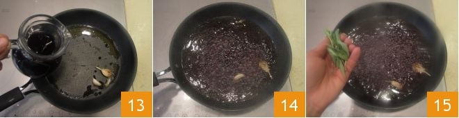 Gießen Sie den Roséwein in die Pfanne, in der Sie es angebraten haben 13, und erhitzen Sie ihn, um den Alkohol zu entfernen 14. Fügen Sie der Sauce weiteren Salbei und Rosmarin hinzu 15, diesmal ganz.