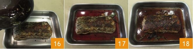 Übertragen Sie die Sauce in die Auflaufform mit dem Fleisch (16-17) und backen Sie sie im vorgeheizten statischen Ofen bei 180° etwa anderthalb Stunden oder bis das Fleisch eine Temperatur von 69/70° im Kern erreicht hat (überprüfen Sie dies mit einer speziellen Sonde). Sobald das Fleisch gar ist, nehmen Sie es aus dem Ofen 18