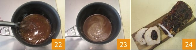 und rühren Sie mit einem Schneebesen um 22, um Klumpenbildung zu vermeiden. Lassen Sie die Sauce bei schwacher Hitze eindicken 23. Servieren Sie den Schweinebraten mit Pflaumen in Scheiben, begleitet von der Weinsauce 24.
