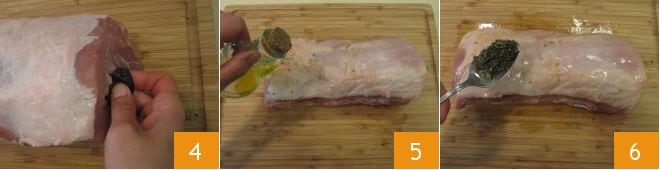 Weiten Sie die beiden Einschnitte an den Enden vorsichtig aus und geben Sie die Pflaumen eine nach der anderen hinein 4, bis das Innere des Fleisches vollständig gefüllt ist. Bestreuen Sie das Fleisch mit Öl 5 und würzen Sie es mit der Mischung aus Salbei und Rosmarin 6, die Sie fein gehackt haben.