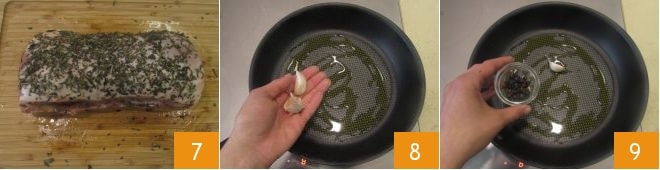 Sie müssen die gesamte Oberfläche des Fleisches bedecken 7. In einer ausreichend großen Pfanne das Öl erhitzen, zwei ungeschälte Knoblauchzehen anbraten 8, die Wacholderbeeren 9