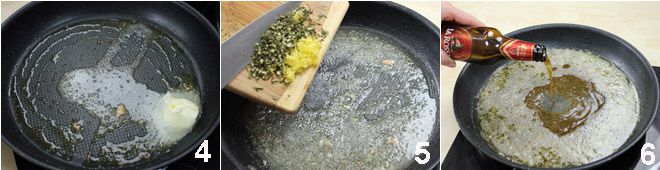 Legen Sie die Koteletts beiseite, und geben Sie in dieselbe Pfanne die Butter 4, die gehackten Kräuter 5 und das Bier 6 hinzu. Lassen Sie es eine Minute eindicken, gut umrühren, und dann das Feuer ausschalten. Legen Sie die Koteletts auf die Teller und begießen Sie jedes mit der Biersoße. Servieren Sie sie noch dampfend.