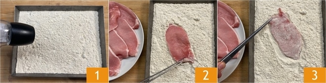 Um das Schweinefilet in Milch zuzubereiten, geben Sie das Mehl in eine Auflaufform, salzen 1 und pfeffern Sie. Mehlieren Sie die Fleischscheiben von beiden Seiten und entfernen Sie den Überschuss 2 3.