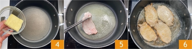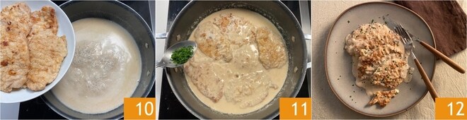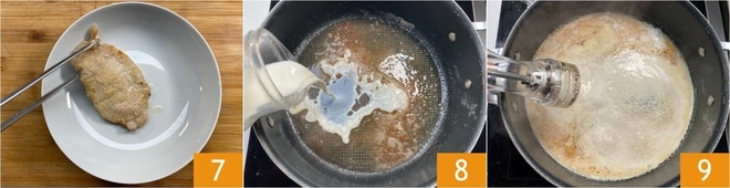 Übertragen Sie das Fleisch auf einen Teller und halten Sie es warm 7. Gießen Sie die Milch in dieselbe Pfanne 8, salzen und pfeffern Sie 9 und lassen Sie es 4 Minuten eindicken.