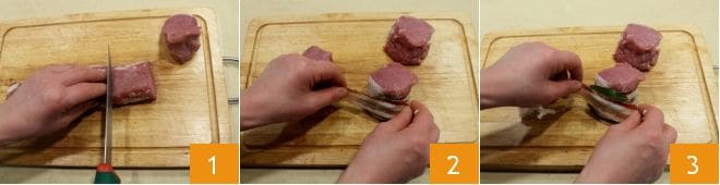 Um die Schweinemedaillons mit Roquefort zuzubereiten, beginnen Sie damit, die Lende in 4 Filets von etwa 200 g jedes zu schneiden 1. Wickeln Sie sie dann in eine Scheibe Speck 2, legen Sie an die Seiten des Filets 2 Salbeiblätter und bedecken Sie es mit einer weiteren Speckscheibe 3.