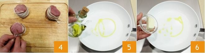 Zu diesem Zeitpunkt binden Sie die Filets mit Küchengarn, damit sie beim Garen besser die Form behalten 4. Jetzt, da das Fleisch bereit ist, bereiten Sie die Pfanne zum Garen vor: Geben Sie einen Schuss Öl hinzu 5 und fügen Sie die Butter hinzu 6, um sie bei niedriger Hitze zu schmelzen.