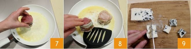 Legen Sie die Schweinefilets hinein 7 und lassen Sie sie bei mittlerer Hitze von 4 bis 6 Minuten pro Seite garen, je nachdem, wie Sie die Garstufe bevorzugen (es ist besser, sie nicht zu lange zu garen, um zu vermeiden, dass das Fleisch trocken wird); während des Garens wenden Sie sie auch auf die andere Seite 8. Schneiden Sie inzwischen den Roquefort-Käse in Stücke 9.