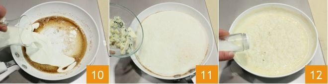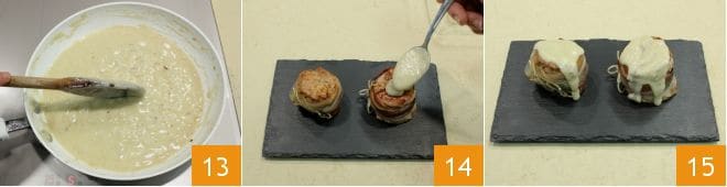 Wenn die Medaillons fertig sind, legen Sie sie beiseite und geben Sie in die gleiche Pfanne, in der Sie gekocht haben, die Sahne 10 hinzu und fügen Sie den Roquefort hinzu 11; lassen Sie ihn bei mittlerer Hitze schmelzen, salzen Sie nach Geschmack 12 und rühren Sie von Zeit zu Zeit mit einem Holzlöffel um.
