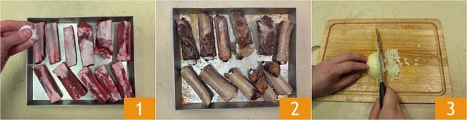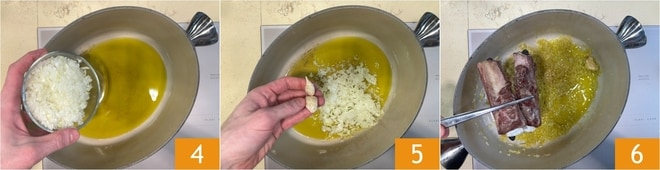 In einem großen Topf erhitzen Sie etwas Öl, dann fügen Sie die gehackte Zwiebel 4 und den Knoblauch 5 hinzu. Braten Sie bei mittlerer Hitze, bis die Zwiebel transparent wird. An diesem Punkt geben Sie die Schweinerippchen in den Topf 6.