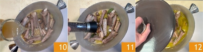 Decken Sie mit heißer Brühe ab, pfeffern Sie nach Geschmack und bringen Sie es zum Kochen, dann reduzieren Sie die Hitze, decken Sie den Topf ab 12 und lassen Sie es sanft für etwa 2 Stunden köcheln, bis die Rippchen zart sind. Rühren Sie gelegentlich um und fügen Sie bei Bedarf mehr Brühe oder Wasser hinzu.