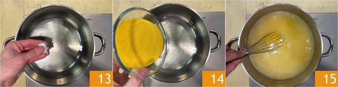 Während die Rippchen kochen, bereiten Sie die Polenta zu: bringen Sie gesalzenes Wasser in einem Topf zum Kochen 13, dann fügen Sie das Maismehl für Instant-Polenta hinzu und kochen Sie die angegebene Zeit auf der Verpackung, wobei Sie ständig mit dem Schneebesen rühren 15.