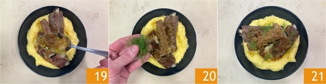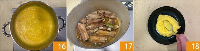 Halten Sie die fertige Polenta warm 16. Einmal gekocht, probieren Sie die Rippchen und passen Sie Salz und Pfeffer an. Servieren Sie, indem Sie am Boden eine Schicht Polenta verteilen 18.