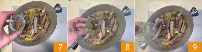 Salzen Sie, dann würzen Sie mit Fenchelsamen 7 und Lorbeerblättern 8. Löschen Sie mit Weißwein ab und lassen Sie den Alkohol verdunsten 9.