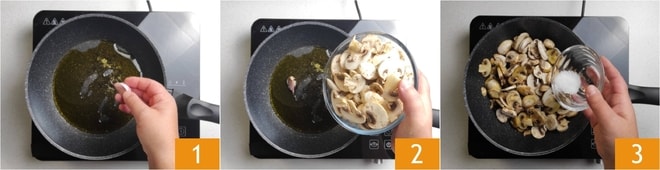 Um die Schweinelende in der Pfanne zuzubereiten, beginnen Sie mit der Reinigung der Champignon-Pilze. Schneiden Sie das untere Ende des Stiels, das normalerweise erdig ist, ab und entfernen Sie die Haut, die den Hut bedeckt. Reinigen Sie die Pilze mit einem sauberen, feuchten Tuch, um eventuelle Erdreste zu entfernen. In einer Pfanne geben Sie 15 g Öl, das von der Gesamtsumme genommen wird, fügen Sie eine Knoblauchzehe in der Schale hinzu und lassen Sie sie anbraten 1. Fügen Sie die Pilze hinzu 2 und würzen Sie mit Salz 3.