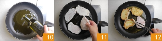 In einer anderen Pfanne geben Sie die restlichen 15 g Öl 10, legen Sie die Schweinelenden-Scheiben hinein 11 und lassen Sie sie bei hoher Hitze 1 Minute pro Seite anbraten 12.