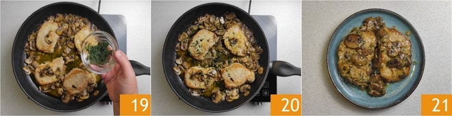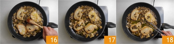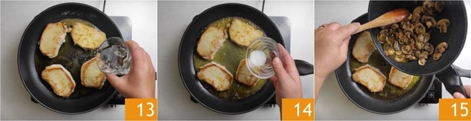 Mit Weißwein ablöschen 13 und den Alkohol verdampfen lassen. Mit Salz abschmecken 14 und bei niedriger Hitze 10 Minuten weiterkochen. Fügen Sie dann die Pilze mit ihrem gesamten Bratensaft hinzu 15.