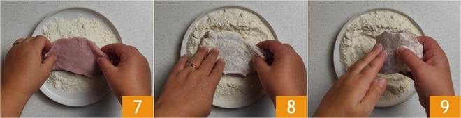 Wenden Sie beide Seiten der Scheiben in Mehl 7 8 und entfernen Sie das überschüssige Mehl 9.