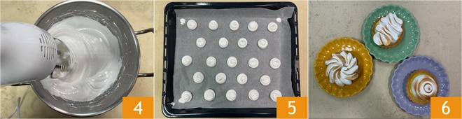 Entfernen Sie nun die Schüssel vom Feuer und vom Wasserbad und schlagen Sie die Mischung mit einem elektrischen Handmixer 4, bis das Baiser vollständig abgekühlt ist. Die Mischung sollte glänzend und von der Konsistenz wie Rasierschaum sein und ist fertig, wenn Sie beim Anheben des Mixers Spitzen sehen. Sie können das Baiser auf zwei Arten verwenden. Füllen Sie es in einen Spritzbeutel mit Sterntülle und dressieren Sie 30 Tupfen auf ein mit Backpapier ausgelegtes Blech 5. Backen Sie im statischen Ofen bei 90°C für etwa 2 Stunden. Sie sind fertig, wenn sie trocken, sehr leicht und innen hohl sind. Oder verwenden Sie das Schweizer Baiser, um Ihre Desserts zu dekorieren, und flambieren Sie es mit einem Brenner 6.