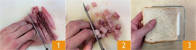 Um die Schwertfisch-Frikadellen zuzubereiten, entfernen Sie zuerst die Haut und den Mittelgräten des Schwertfischs und schneiden Sie ihn zuerst in Streifen 1 und dann in etwa 1 cm große Würfel 2. Geben Sie alles in eine Schüssel und stellen Sie es beiseite. Weichen Sie das Toastbrot in Milch ein 3.