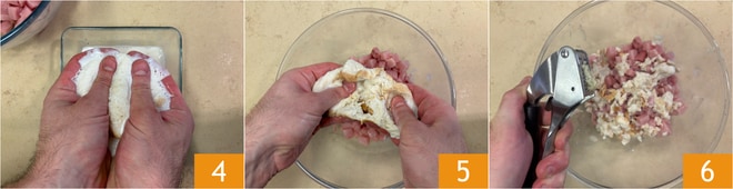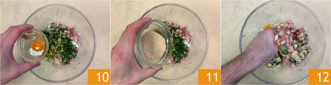 Geben Sie das Ei 10 und die Semmelbrösel 11 in die Schüssel, dann kneten Sie 12, bis Sie eine kompakte, aber formbare Masse erhalten. Falls nötig, fügen Sie mehr Semmelbrösel hinzu.