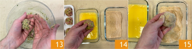 Formen Sie 12 Frikadellen gleicher Größe und leicht ovaler Form 13, dann wenden Sie sie zuerst in Ei 14 und dann in Semmelbröseln 15, sodass die Panade gut haftet.
