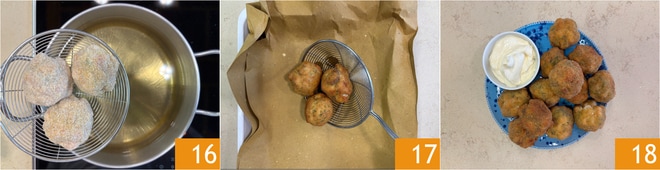 Frittieren Sie in Erdnussöl bei 180°C für 10 Minuten oder bis sie goldbraun sind 16. Frittieren Sie 3-4 Frikadellen gleichzeitig, um die Öltemperatur nicht zu sehr zu senken. Legen Sie sie dann auf saugfähiges Papier 17, um überschüssiges Öl zu entfernen. Die Schwertfisch-Frikadellen sind bereit zum Servieren, vielleicht mit Mayonnaise 18.