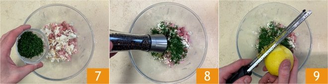 Fügen Sie die gehackte Petersilie hinzu 7, würzen Sie mit Salz und Pfeffer 8 und geben Sie auch die abgeriebene Zitronenschale hinzu 9.