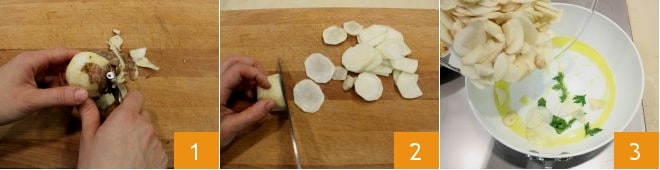 Um den Schwertfisch in Kruste mit Topinamburpüree zuzubereiten, beginnen Sie damit, die Topinambur zu schälen 1 und schneiden Sie sie in Scheiben 2. Lassen Sie in einer Pfanne den Knoblauch mit etwas Öl und den Petersilienblättern anbraten, fügen Sie dann die Topinamburscheiben hinzu 3 und kochen Sie sie bei niedriger Hitze etwa 20 Minuten lang, wobei Sie ab und zu etwas Gemüsebrühe hinzufügen, um das Garen zu erleichtern.