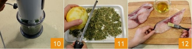 Pürieren Sie alles 10, um eine sandige Mischung zu erhalten, die Sie auf ein Tablett gießen und mit unbehandelter Zitronenschale aromatisieren 11. Bestreichen Sie die Schwertfischscheiben auf beiden Seiten mit Olivenöl 12