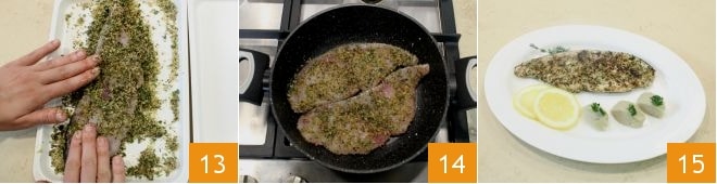Legen Sie eine Scheibe des Fisches nach der anderen in die Panade und massieren Sie die Oberfläche, um sie zu verteilen 13. Erhitzen Sie einen großen Topf auf dem Herd, und wenn er heiß ist, beginnen Sie, die Schwertfischscheiben zu garen 14: Ein paar Minuten pro Seite genügen, damit die Außenseite knusprig wird, während das Fleisch innen weich und saftig bleibt. Sobald der Fisch gar ist, schalten Sie den Herd aus und verteilen Sie auf den Serviertellern eine Scheibe Schwertfisch in Kruste und das Topinamburpüree 15.