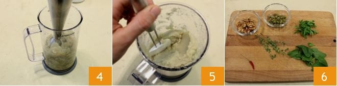 Einmal gekocht, pürieren Sie es mit einem Stabmixer 4, um ein cremiges und homogenes Püree zu erhalten 5. Beiseite legen und mit dem Schwertfisch fortfahren: Bereiten Sie die aromatischen Kräuter, die Nüsse und die von der Konservierungsflüssigkeit abgetropften Kapern vor 6: Diese werden für die Kruste der Schwertfischfilets benötigt.