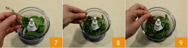 Geben Sie die Minzblätter, Thymian 7, Petersilie, Kapern, Nüsse 8 und die Chilischote 9 in einen Mixer.