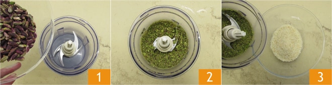Um das Schwertfischschnitzel zuzubereiten, geben Sie die Pistazien in den Mixer 1 und zerkleinern Sie sie zu einem Pulver 2. Mischen Sie das gehackte Pistazienpulver mit dem Panko 3.