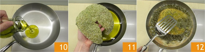 Erhitzen Sie das Öl in einer Pfanne auf 160°-170°10, tauchen Sie das Fischschnitzel hinein 11 und braten Sie es von beiden Seiten in Öl 12.