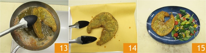 Wenn die Oberfläche schön goldbraun ist 13, auf Küchenpapier abtropfen lassen 14 und nach Belieben salzen. Servieren Sie das Schwertfischschnitzel heiß 15 mit einem frischen Salat der Saison.