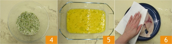 So erhalten Sie die Panade 4. Schlagen Sie in einer Auflaufform die Eier auf 5 und tupfen Sie den Schwertfisch mit Küchenpapier ab, um ihn zu trocknen 6.