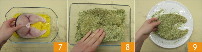 Tauchen Sie die Schwertfischscheiben zuerst in das geschlagene Ei 7 und dann in die Panade 8, sodass jede Seite gut bedeckt ist 9.