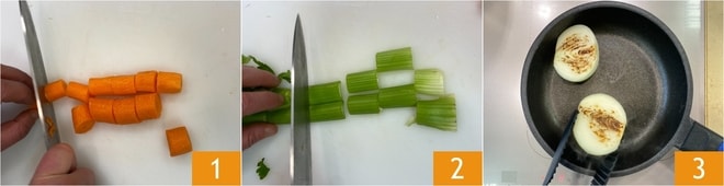 Um die Scrippelle mbusse zuzubereiten, beginnen Sie zuerst mit der Brühe. Schälen Sie die Karotten und schneiden Sie sie in Stücke 1, dann machen Sie dasselbe mit dem Sellerie 2. Halbieren Sie die Zwiebel und braten Sie sie für ein paar Minuten in einer beschichteten Pfanne an 3.