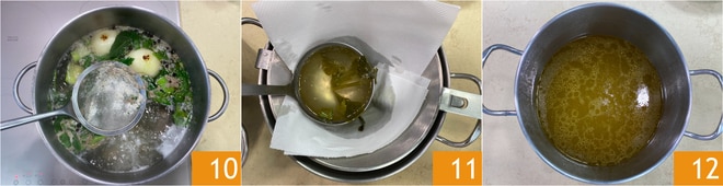 Bringen Sie alles zum Kochen, indem Sie die Flamme auf Maximum stellen; ab diesem Moment 3 Stunden bei mittlerer Hitze kochen. Während dieser Zeit muss die Brühe abgeschöpft werden, das heißt, das Fett und die Verunreinigungen, die an die Oberfläche kommen, müssen entfernt werden 10. Sobald die Brühe fertig ist, filtern Sie sie durch ein Sieb, das mit Küchenpapier bedeckt ist 11. Würzen Sie die gefilterte Brühe mit Salz und halten Sie sie warm (Tipps zur Verwendung des gekochten Fleisches finden Sie am Ende des Rezepts) 12.