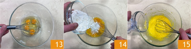 Gehen Sie zu den Scrippelle über: Schlagen Sie in einer Schüssel die Eier mit einem Schneebesen 13, dann fügen Sie nach und nach das Mehl hinzu, rühren Sie ständig, um keine Klumpen zu bilden 14. Gießen Sie das Wasser langsam ein und rühren Sie weiter 15.