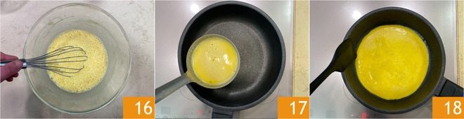 Sie sollten einen sehr flüssigen und homogenen Teig erhalten 16. Erhitzen und ölen Sie eine beschichtete Pfanne mit einem Durchmesser von 16 cm, dann geben Sie eine Kelle Teig in die Mitte 17 und drehen Sie die Pfanne, um den Teig gleichmäßig auf dem Boden zu verteilen. Kochen Sie 1-2 Minuten bei mittelhoher Hitze, dann drehen Sie die Scrippella 18 und kochen Sie die andere Seite für die gleiche Zeit.