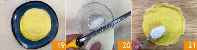 Sobald sie fertig sind, stapeln Sie die Scrippelle auf einem Teller 19; mit diesen Mengen sollten Sie 12 Stück erhalten. Jetzt reiben Sie den Pecorino 20. Legen Sie eine Scrippella nach der anderen auf die Arbeitsfläche und verteilen Sie einen Löffel geriebenen Pecorino in der Mitte 21.