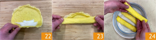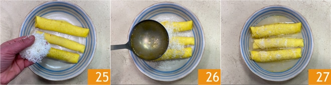 Rollen Sie die Scrippella zu einer Art Cannolo 22 23 und machen Sie so weiter mit allen anderen. Wenn sie alle fertig sind, legen Sie 3 aufgerollte Scrippelle in jeden tiefen Teller 24.
