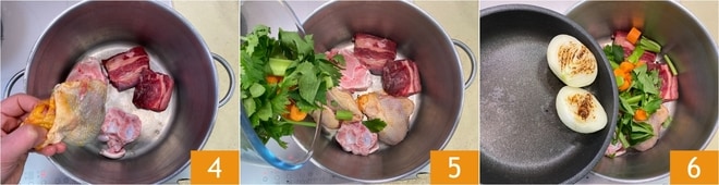 Geben Sie in einen großen Topf die verschiedenen Fleischsorten 4, dann fügen Sie den Sellerie mit seinen Blättern, die Karotten 5 und die angebratenen Zwiebeln 6 hinzu.