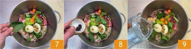 Aromatisieren Sie mit Lorbeer 7, Wacholderbeeren 8 und Nelken, dann fügen Sie eine Prise Salz hinzu und bedecken Sie alles mit Wasser 9.